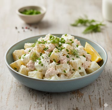 Χωρίς μαγιονέζα: Η κρεμώδης υφή έρχεται από το γιαούρτι, κάνοντας τη συνταγή πολύ πιο ελαφριά.