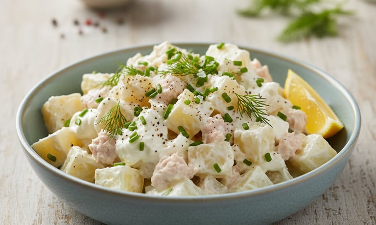 Ανάμιξη (2 λεπτά): Σε ένα μπολ, βάλε τα κυβάκια πατάτας. Πρόσθεσε τον τόνο, το γιαούρτι και τον χυμό λεμονιού.