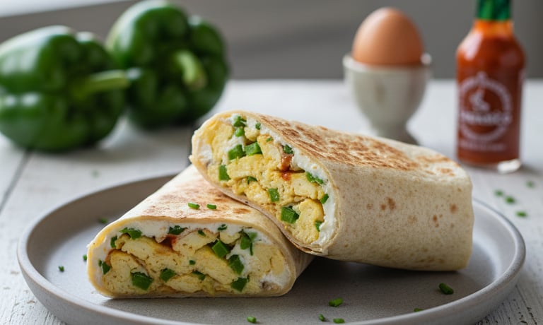 Γέμιση (2:30 λεπτά): Άπλωσε το τυρί κρέμα στο κέντρο της τορτίγιας. Πρόσθεσε το ψημένο αβγό και τα ψιλοκομμένα λαχανικά. Ρίξε λίγη πικάντικη σάλτσα αν θες.