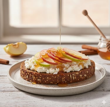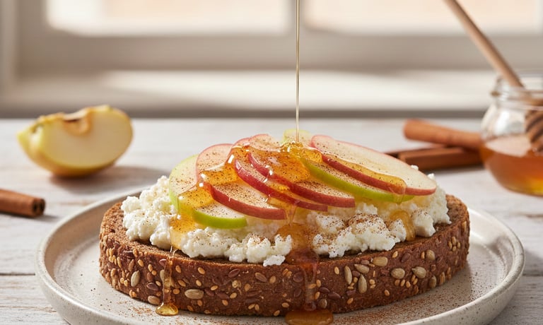 Ισορροπημένο Σνακ: Ένας συνδυασμός πρωτεΐνης (Κατίκι), σύνθετων υδατανθράκων και φυτικών ινών (ψωμί ολικής, μήλο) που προσφέρει ενέργεια και κορεσμό.