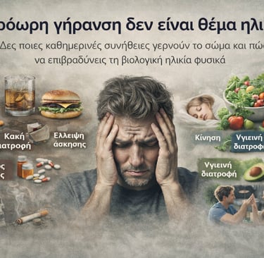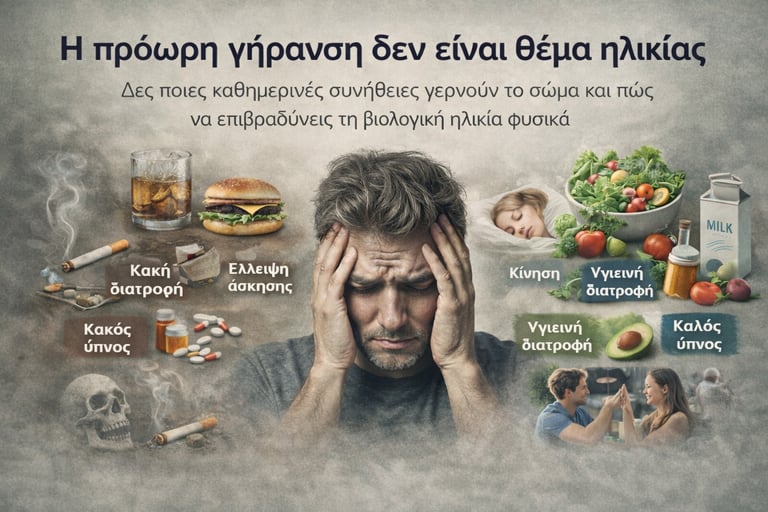 Η πρόωρη γήρανση προκαλείται κυρίως από κακή διατροφή, έλλειψη άσκησης, κακό ύπνο, στρες, κάπνισμα και φλεγμονή. Η αλλαγή τρόπου ζωής μπορεί να επιβραδύνει σημαντικά τη βιολογική ηλικία.